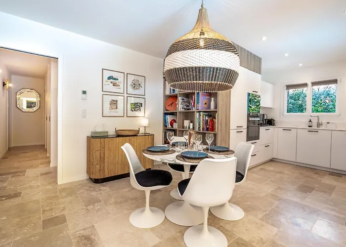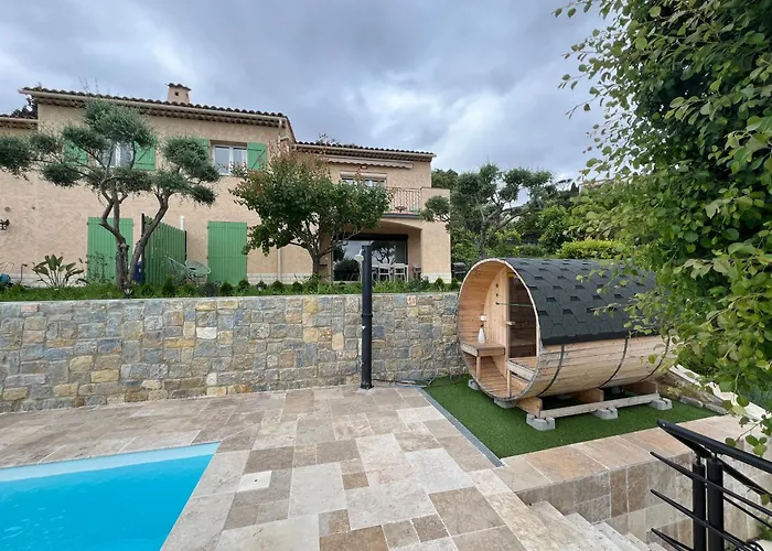 Villa climatisée 3 chambres proche de Cannes et du bord de mer de 120 m² est située à 6 km du Palais des Festivals et des Congrès de Cannes et à 35 km de l'aéroport de Nice-Côte d'Azur. La villa a un parc aquatique, un espace de jeu et un cours de golf, et est située non loin de la Plage des sables d'or .